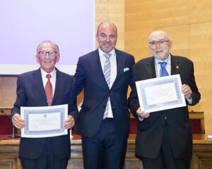 Entregó el premio José de Lara Rey, Decano del COIN y lo recogió el propio José María Sánchez Carrión a quien vemos a la derecha de la imagen. A la izda. vemos a Agustín Montes, Asociado de Honor.