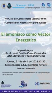 «El amoniaco como vector energético», es una conferencia que será impartida por el Dr. D. José Fabián Plaza Fernández. El ponente es responsable de ADVANCED THERMAL DEVICES. La exposición está encuadrada en VII Ciclo SOERMAR-UPM (Combustibles Alternativos para Buques) que se hace por el 250 aniversario.