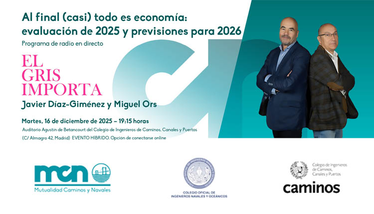 Mutualidad Caminos y Navales, en colaboración con el Colegio de Ingenieros de Caminos y el Colegio Oficial de Ingenieros Navalesy Oceánicos, te invita a acudir como público al programa de radio en directo ‘El Gris Importa’, presentado por Javier Díaz-Giménez y Miguel Ors, dos grandes referentes en el sector económico, que harán una evaluación de lo sucedido a nivel político y económico en 2025 y de sus perspectivas para 2026.