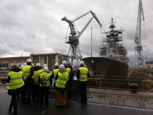 A continuación el grupo, se dirigió a las instalaciones de NAVANTIA. Antes de recorrer su millón de metros cuadrados y descubrir sus gigantescos diques, la primera parada se produjo en el edificio de Dirección, donde fueron recibidos por su Director D. Jorge Filgueiras Ameneiros, quién les hizo una presentación de la historia del astillero y las construcciones anteriores, actuales y futuras. A continuación, en la sala de diseño virtual, el Jefe de Ingeniería, el del programa AOR para Australia y el Jefe del Programa F110 hicieron una presentación de sus respectivos programas. Posteriormente se efectuó una visita al resto de instalaciones del astillero, destacando los diques nº2 y nº3 y las gradas de construcción.
